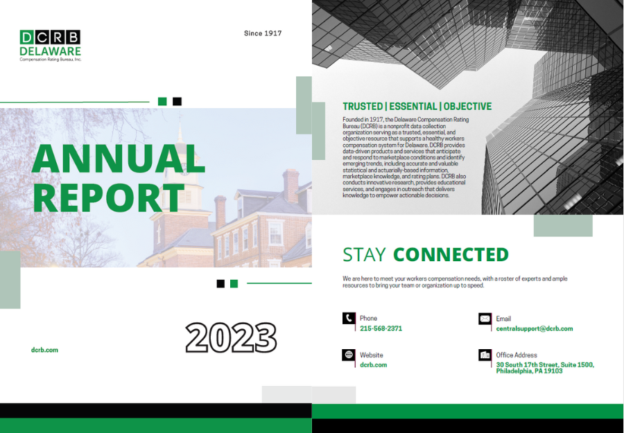 The Delaware Compensation Rating Bureau is pleased to announce the release of five of its annual report publications, including the 2023 Annual Report, State of the Line Report, State Activity Report, Medical Activity Report, and Opioid Supplement Report. These reports contain valuable information, data, and insights about our organization, the state’s workers compensation market, and relevant medical data. Please refer to DCRB Circular No. 1034 for more information.